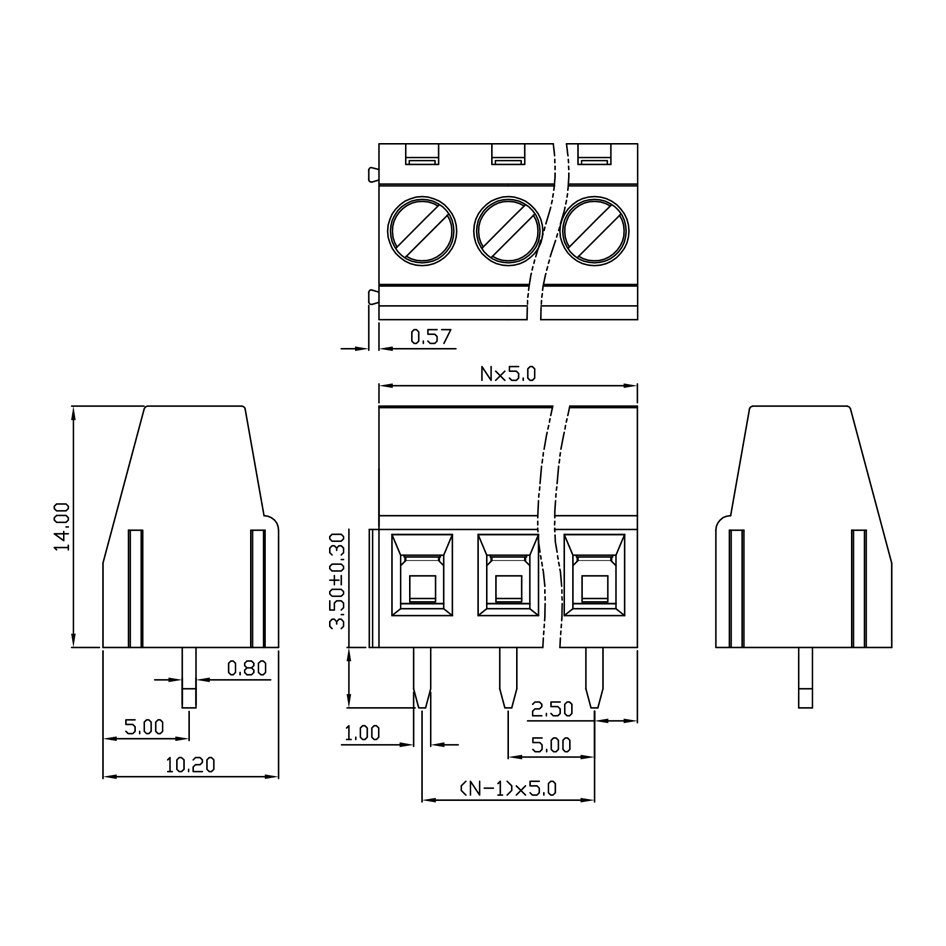 Fixed connectors, Nominal operating current: 17.5 A, Rated voltage (III/2): 400 V, Rated cross-section: 1.5 mm2, Number of potentials: 2-24, Number of rows: 1, Number of bits per row: 2-24, Series: DB128V, Pin pitch: 5.0 mm, Wiring method: Screw connection with crimp, Screw head size: L slotted, Mounting: Wave soldering, Wires/conductors PCB connection direction: 0°, colour: green, pin arrangement: straight, pin [P]: 3.5 mm, number of pins per potential: 1, packaging type: carton. The product can be composed of connectors of different bit numbers!