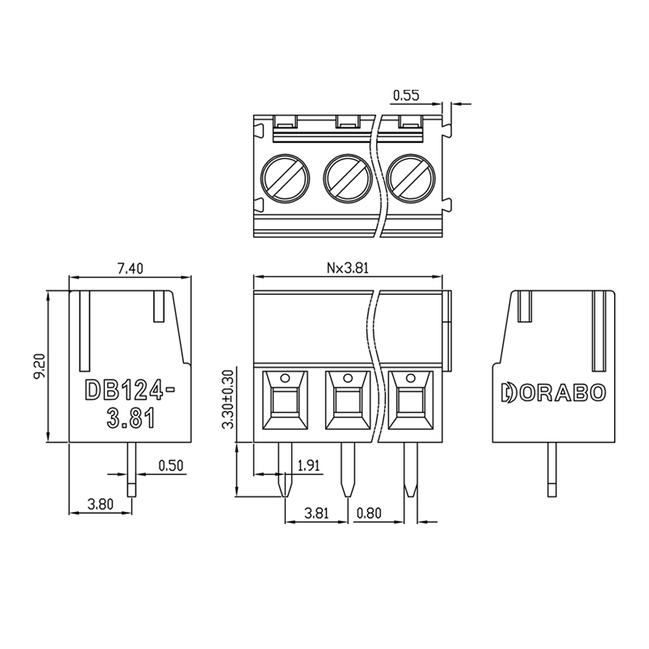 Fixed connectors, Nominal operating current: 13.5 A, Rated voltage (III/2): 200 V, Rated cross-section: 1.5 mm2, Number of potentials: 2-24, Number of rows: 1, Number of pins per row: 2-24, Series: DB124, Pin pitch: 3.81 mm, Wiring: Screw connection with tab, Screw head size: L slotted, Mounting: Wave soldering, Wire/PCB connection direction: 0°, Colour: green, Pins alignment: straight, Solder pins [P]: 3.5 mm, Number of pins per potential: 1 , Packing type: Carton