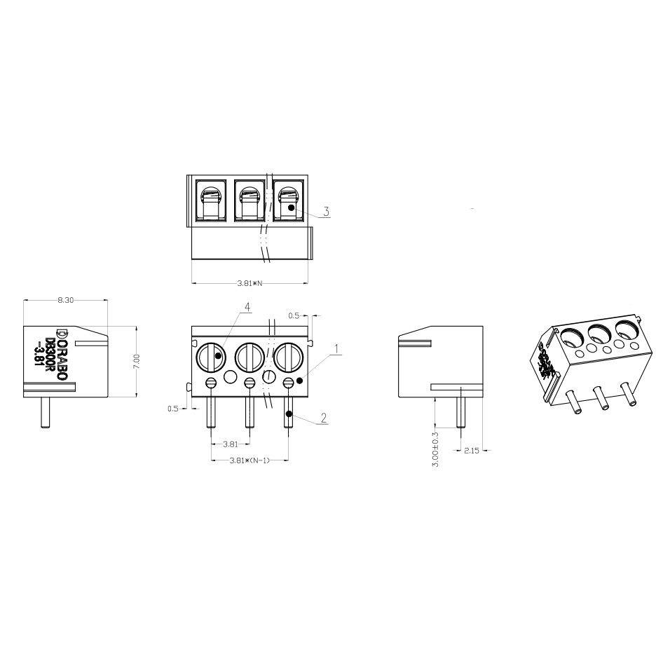 Fixed connectors, Rated current: 10 A, Rated voltage (III/2): 130 V, Rated cross-section: 1 mm2, Number of potentials: 2-24, Number of rows: 1, Number of digits per row: 2-24, Series: DB300R, Pin pitch: 3.81 mm, Wiring: screw connection with wire protection, Mounting: wave soldering, Orientation of lead/PCB connection: 90°, Colour: green, Pin arrangement: Pin [P]: 3.5 mm, Number of pins per potential: 1, Packing type: carton