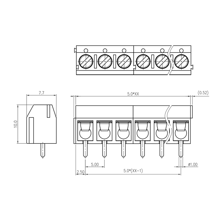 Fixed terminal blocks, nominal operating current: 17.5A, rated voltage (III/2) 250V, nominal cross-section: 1.5mm², number of potentials: 2-24, number of rows: 1, number of positions per row: 2-24, product series: DB301, pin pitch: 5 mm, wiring: screw connection with wire protection, mounting: wave soldering, orientation of wire/PCB connection: 0°, colour : Blue, Pin arrangement: Straight, Pin [P]: 3.5 mm, Number of pins per potential: 1, Packaging type: Carton. When using cold crimp tips, the maximum voltage of 250 V is only reached if the overvoltage type/contamination class II/2 is met.