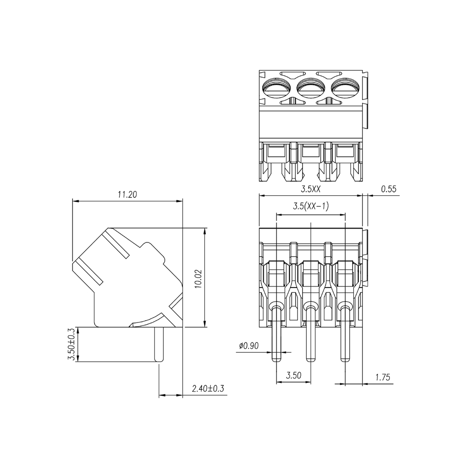 Printed circuit board terminal, nominal current: 17.5 A, rated voltage (III/2): 200 V, nominal cross section: 1.5 mm2, number of potentials: 2-24, number of rows: 1, number of positions per row: 2-24, product range: DB302S, pitch: 3.5 mm, connection method: Screw connection with wire protector, screw head form: H1L Slotted Phillips recess, mounting: Wave soldering, conductor/PCB connection direction: 45 °, color: green, Pin layout: Linear front pinning, Solder pin [P]: 3.5 mm, number of solder pins per potential: 1, type of packaging: packed in cardboard